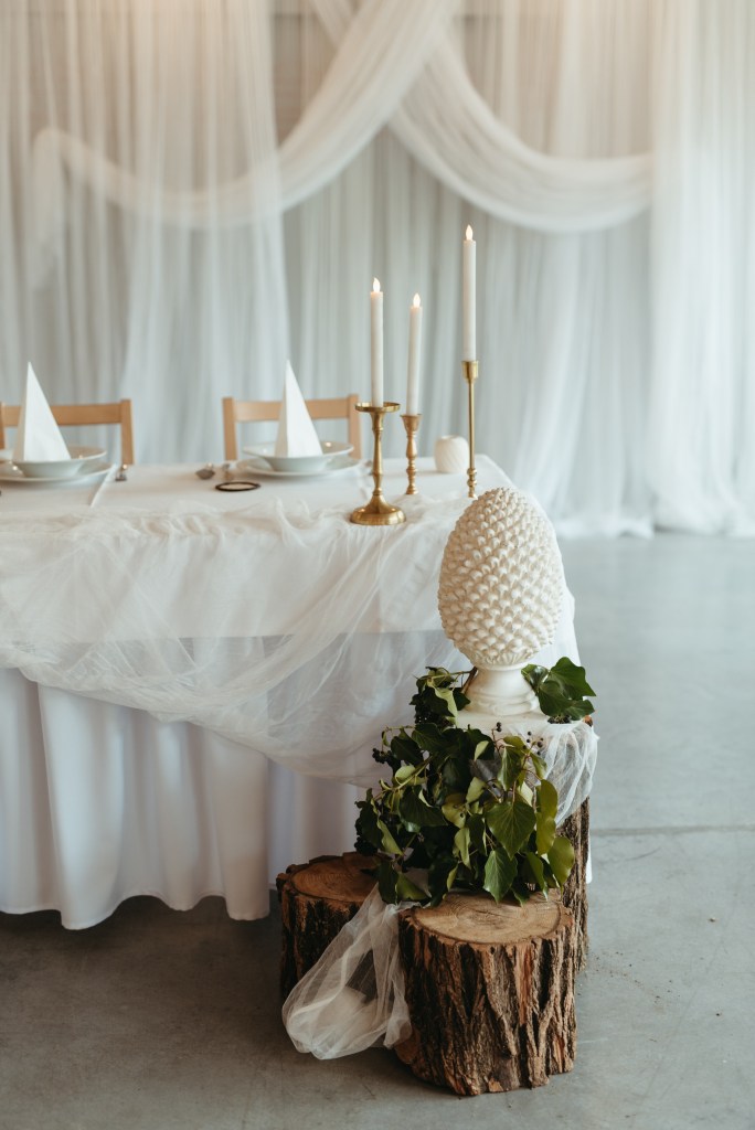 Az elképzelés egy letisztult, és elegáns természet közeli hangulat volt. A fehér különböző texturáival játszva teremtettünk finom kontrasztot a puha tüllök és robosztus kérges rönkök és különféle fa elemek között.